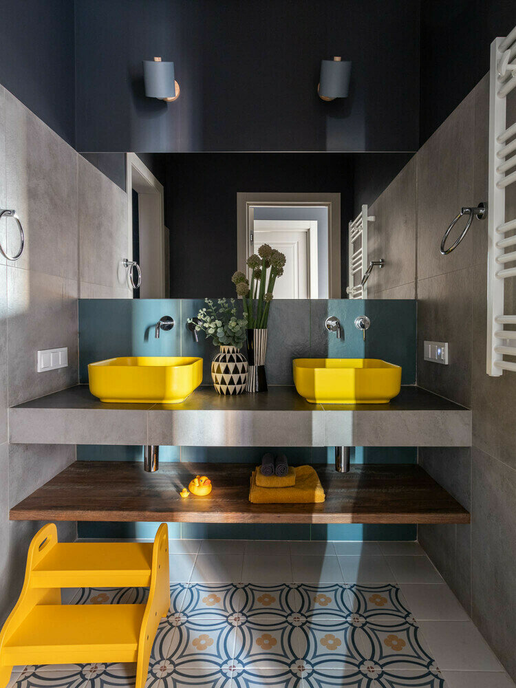 В детском санузле была использована плитка с рисунком — желтый цвет отлично гармонирует с основным морским оттенком, а рисунок цветочков придает помещению игривости.