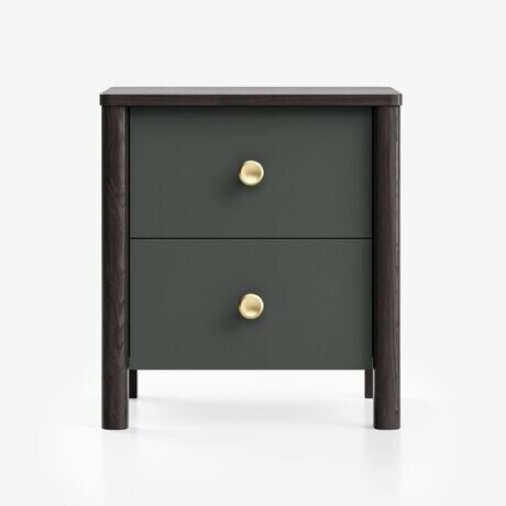 Живая и теплая текстура дерева, стильные дымчатые цвета эмали, формы, полные гармонии - и все это об одном предмете мебели - прикроватной тумбе из коллекции BERGEN Два выдвижных ящика с плавными доводчиками и массивными ручками, каплевидная форма ножек, скругленные углы столешницы - мы позаботились о том, чтобы архитектура этого ассоциировалась с плавными природными формами и привносила гармонию в Вашей спальне.