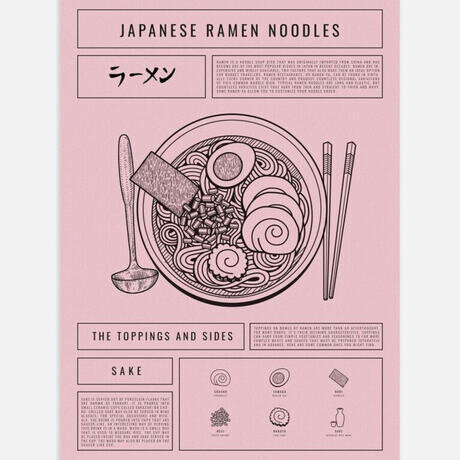 Модные текстовые плакаты с иллюстрациями, изображающими японское блюдо Рамен. Плакат выполнен в приглушенно-розовом цвете, с черным шрифтом и иллюстрациями, создающими крутые контрасты. Грубая зернистость фона придает глубину объекту.
