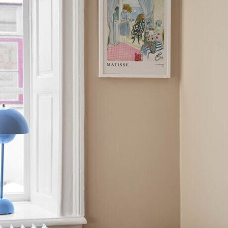Нарисованный мотив женщины, стоящей в дверном проеме балкона и смотрящей на океан. В комнате изображен розовый пол и цветы в вазе на столе. Оригинальный мотив был создан маслом на холсте Анри Матиссом в 1921 году. Мотив обрамлен встроенным паспарту кремового цвета.