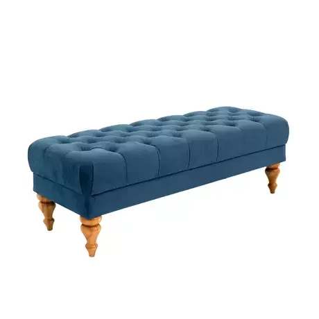 - Каретная стяжка с пуговицами — добавляет интерьеру благородства в стиле честерфилд - Синий велюр — практичный материал, который легко чистится бытовыми средствами - Деревянные точеные ножки — обеспечивают устойчивость и подчеркивают классический характер модели Банкетка отлично впишется как в спальню у изножья кровати, так и в просторную прихожую. С шириной 120 см она станет идеальным местом, чтобы присесть, надевая обувь, или временно разместить вещи. Особенно оценят модель владельцы квартир в классическом или современном стиле с элементами модерна.Технические характеристики:
