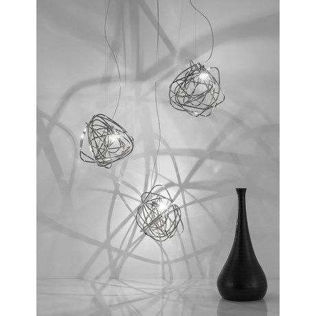 Дизайнеры знаменитого бренда создали интересный концепт предвосхищающий трендовое направление ажурных светильников. У люстры сквозная металлическая конструкция серебристого оттенка и значительная высота – почти два метра. Форму изделия сложно классифицировать, но она стремится к форме шара, диаметром 0,3 метра. Произвольно закрученная проволока создает абстрактную сквозную композицию, с почти скульптурными линиями и объемом. Внутри нее расположен источник света в виде одной лампочки. В ее изготовлении велико значение ручного труда. Только человеческие руки способны создать столь уникальную вещь из самых простых материалов, и придать ей привлекательность. Люстра предназначена для современных интерьеров. Легкая, невесомая объемная инсталляция сверкает разнонаправленными бликами, которые появляются от ее тонких металлических граней, при включенной лампочке. Люстра хороша, как сама по себе, так и в комплекте. Она выглядит в помещении настоящим арт-объектом, создавая абстрактным рисунком хаотичных линий, особую, чарующую атмосферу.