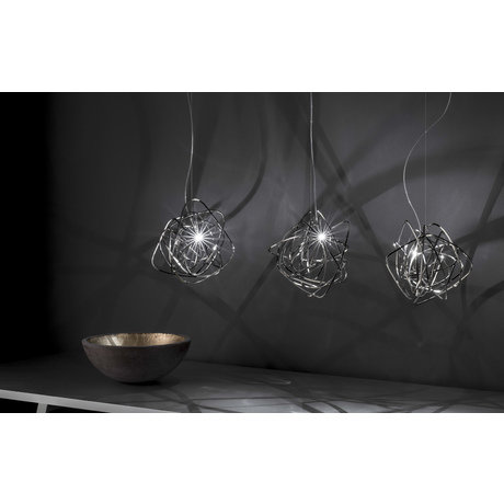 Эта люстра - вдохновенная работа мастеров фабрики Terzani. Она представляет собой объемную инсталляцию для современных интерьеров. Особенность конструкции – легкость, визуальная невесомость и, безусловно, трендовая стилистика. Люстра выглядит хаотично намотанной проволокой вокруг источника света – одной галогеновой лампочки. Металлическая проволока окрашена в цвет «черный никель». При включенной лампочке, ее грани создают разнонаправленные блики, освещающие пространство вокруг себя. Тонкая никелированная нить не прерывается по всей длине. Люстра создана дизайнерским бюро. Она поддерживает в интерьере современную стилистику, демонстрируя последние трендовые направления в области светового дизайна. Люстра подвешена к потолку на длинном металлическом тросике. Общая высота изделия вместе с подвесом, составляет почти два метра. Под потолком тросик крепится к круглому основанию, цвета никель с блестящим покрытием. Люстра выглядит настоящим арт-объектом. Уникальная модель создает в помещении комфортную среду обитания, которая выдает в вас отменный вкус, являясь продолжением вашей личности.