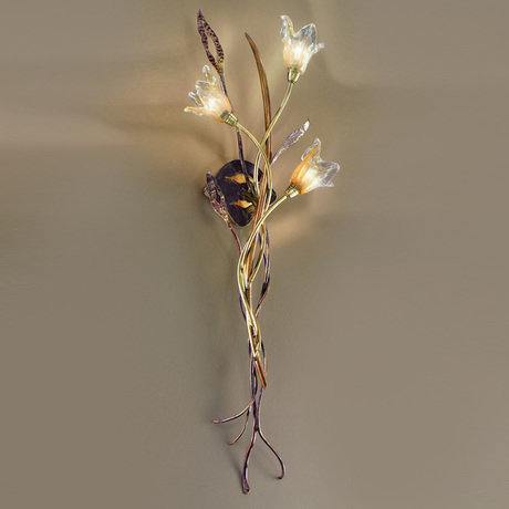Настенный светильник выполнен из кованного металла. Дизайн в виде растения с закрученными стеблями. Лампы-бутоны из стекла прозрачно-янтарного цвета. Цвет арматуры: коричнево-бордовый с золотом. Количество лампочек: 3; Мощность: 3 x 40 Вт; Тип лампы: Галогенная, G9