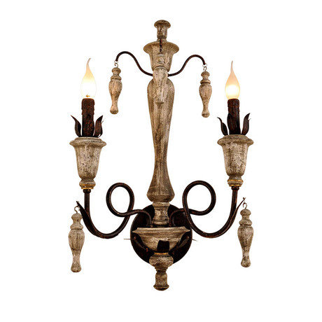 Настенный светильник FONTENELLE двухрожковый, с изысканным дизайном в виде подсвечника. Основание — резной массив дерева серого цвета. Металлические рожки с отделкой «под ржавчину».Декор в виде деревянных подвесок в форме бубенчиков. Объем -0,090м3. Американский винтажный стиль. Количество лампочек: 2.