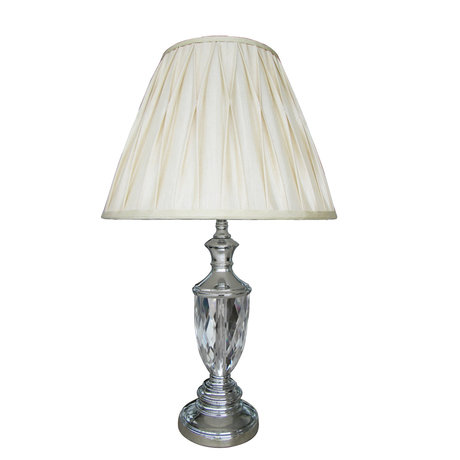 Лампа настольная с бежевым абажуромТатьяна НинуаЛампа выгладит очень нежно. Прозрачная стеклянная ножка под хрусталь на основании из металла. Сколы, царапины отсутствуют. Светло бежевый абажур. Цвет соответствует фото.